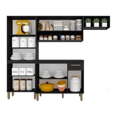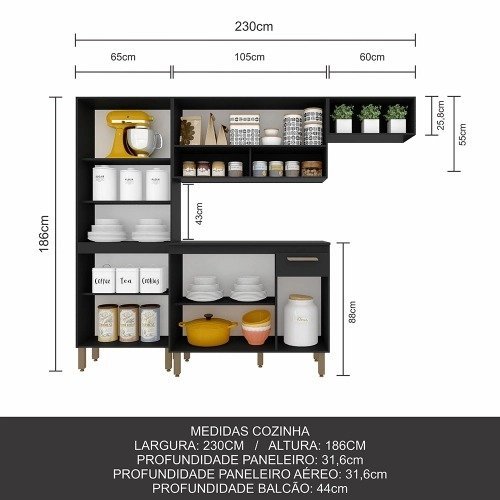 O Armário Cozinha Tieli 4 peças é um lançamento pensado para proporcionar funcionalidade e beleza para agregar a sua cozinha! Medida do Produto Montado: a: 186CM l: 230CMMedida do Balcão: A:88cm L:105cm P:44cmMedida do Paneleiro 4 portas: A:186cm L:65cm P:31,6cmMedida do Aéreo: A:49cm L:105cm P:31,6cmMedida do Aéreo de Nicho: A:25,8cm L:32,2 cm P:31,6cmMateriais de Fabricação- Fabricada em mdp com acabamento em ff (Finish Foil)- Tonalidade: Preto Fosco- Corrediça Metálica- Estruturado com madeira de altíssima qualidade, evitando fungos e mofoConteúdo da Embalagem: – 01 Cozinha- Manual de Montagem- Acessórios para Montagem: Cavilhas, Parafusos, Sache de cola, Etiqueta, Tapa furo. Observações Importantes: – Imagens ambientadas meramente ilustrativas, objetos decorativos não compõe o produto; – Produto novo, garantia somente para defeitos de fabricação: 3 meses; – Não realizamos entregas em zonas rurais, via caminhos fluviais e distritos, não aceitamos cep geral; – Não trabalhamos com entrega agendada. O recebedor deve ter mais de 18 anos. O valor do frete não inclui: subida de escada, elevador ou lançamento de produto, em condomínio residencial a entrega é feita somente até a portaria. As entregas são realizadas em dias e horários comerciais; – Ao receber o produto observe se a embalagem está em perfeita condição. Confira atentamente a quantidade de volumes; – Produto entregue desmontado. é responsabilidade do cliente a montagem/instalação do produto, inclusive despesa para sua realização. Recomendamos a contratação de um profissional especializado; – Evitar a exposição direta à luz solar e à umidade. Limpar com pano macio e seco, não utilizar produtos químicos; – A cor do produto pode variar de acordo com o monitor, a iluminação do ambiente ou sua percepção visual.